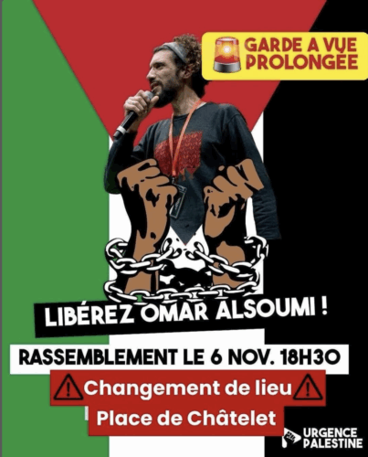 Omar Alsoumi est un Palestinien en exil. Omar Alsoumi défend comme d’autres la libération de sa terre et la fin de l’oppression de son peuple. Omar Alsoumi organise avec d’autres Urgence Palestine. Le génocide là-bas tout comme la répression et l’impunité ici doivent être stoppés. Enfin, la liberté d’expression et d’organisation doivent être défendus.