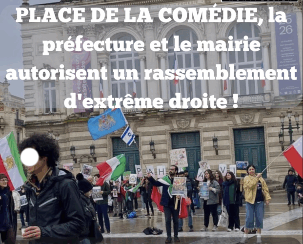La place de la Comédie est interdite par la préfète et le maire M. Delafosse à BDSF/UP qui manifeste contre le génocide de l’État d’Israël à l’encontre des Palestinien.ne.s mais elle est permise à l’extrême droite iranienne qui manifeste en soutien aux bombardements criminels des USA et Israël qui font des milliers de mort.e.s iranien.e.s !